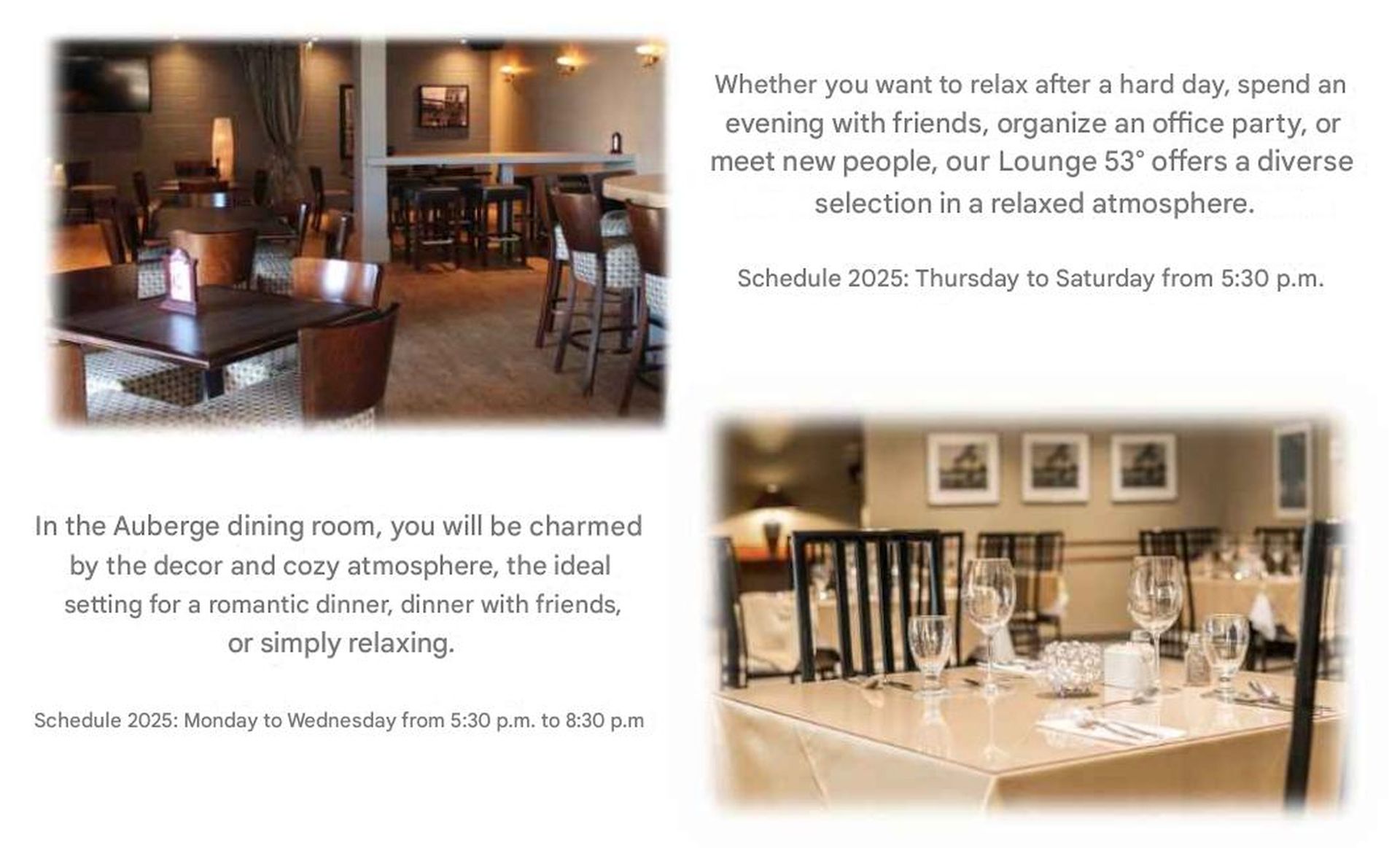 Reservation : 1 888-638-7201, 66 rue Des Groseilliers, C.P. 90, Radisson, Quebec|reservations@aubergeradisson.ca